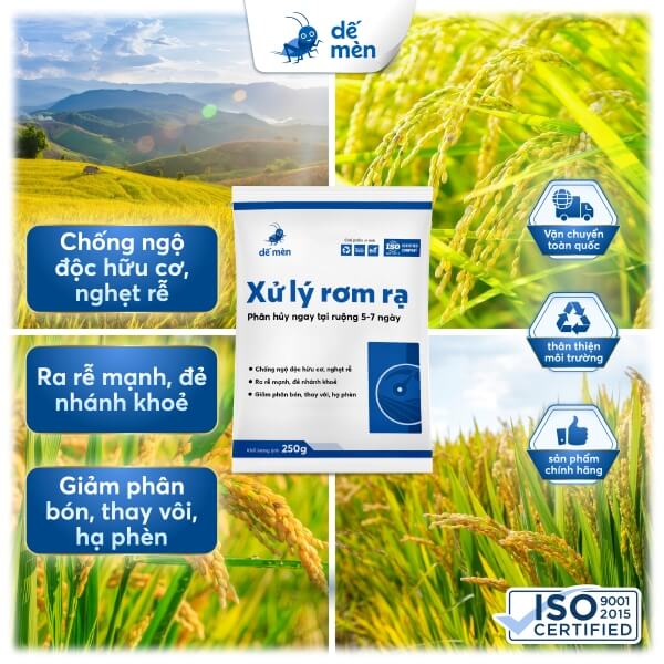 Chế phẩm xử lý rơm rạ giúp phân hủy gốc rạ, rơm trực tiếp trên ruộng. Giúp hạ phèn, bung rễ, chống ngộ độc hữu cơ, nghẹt rễ.